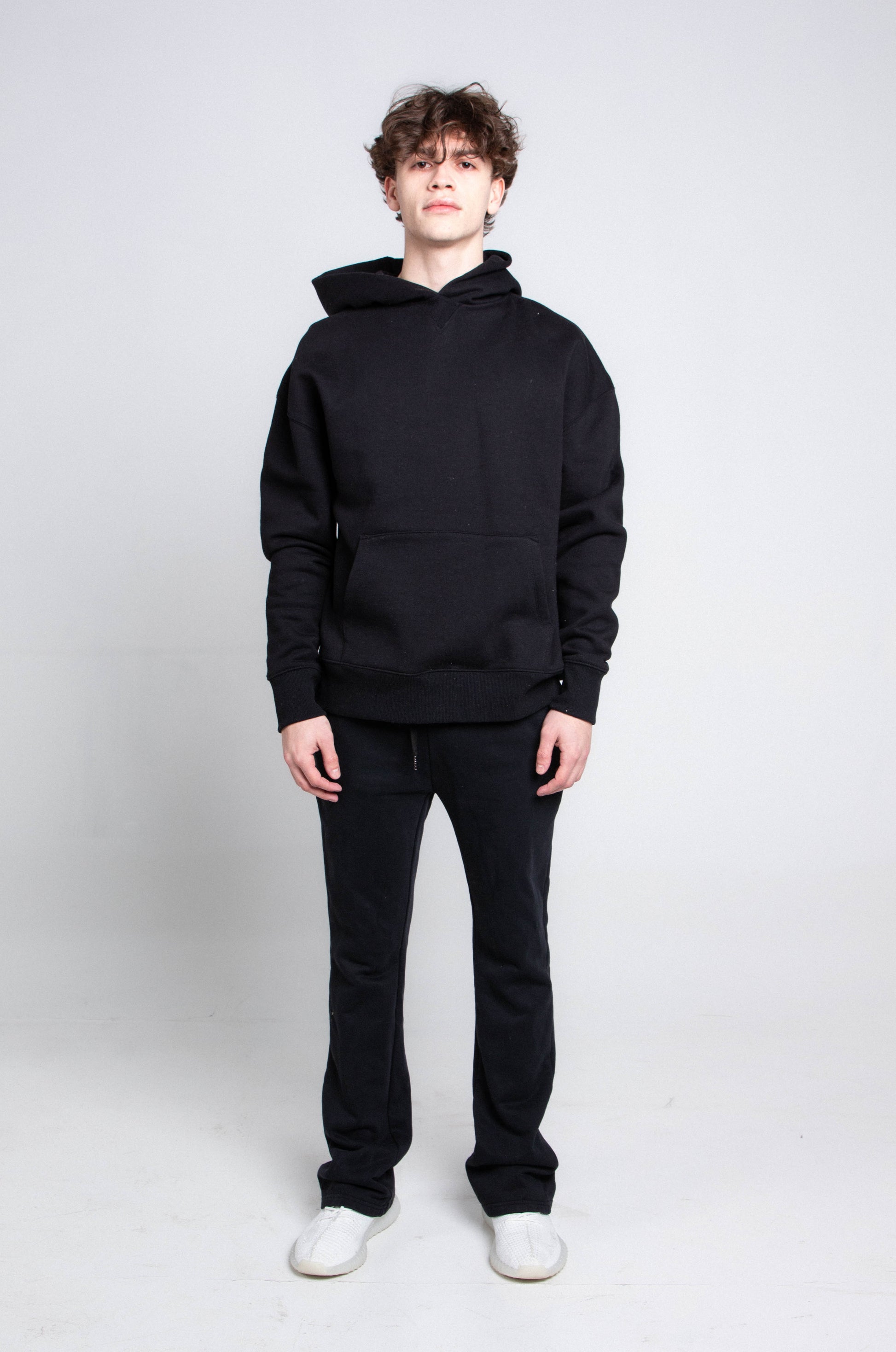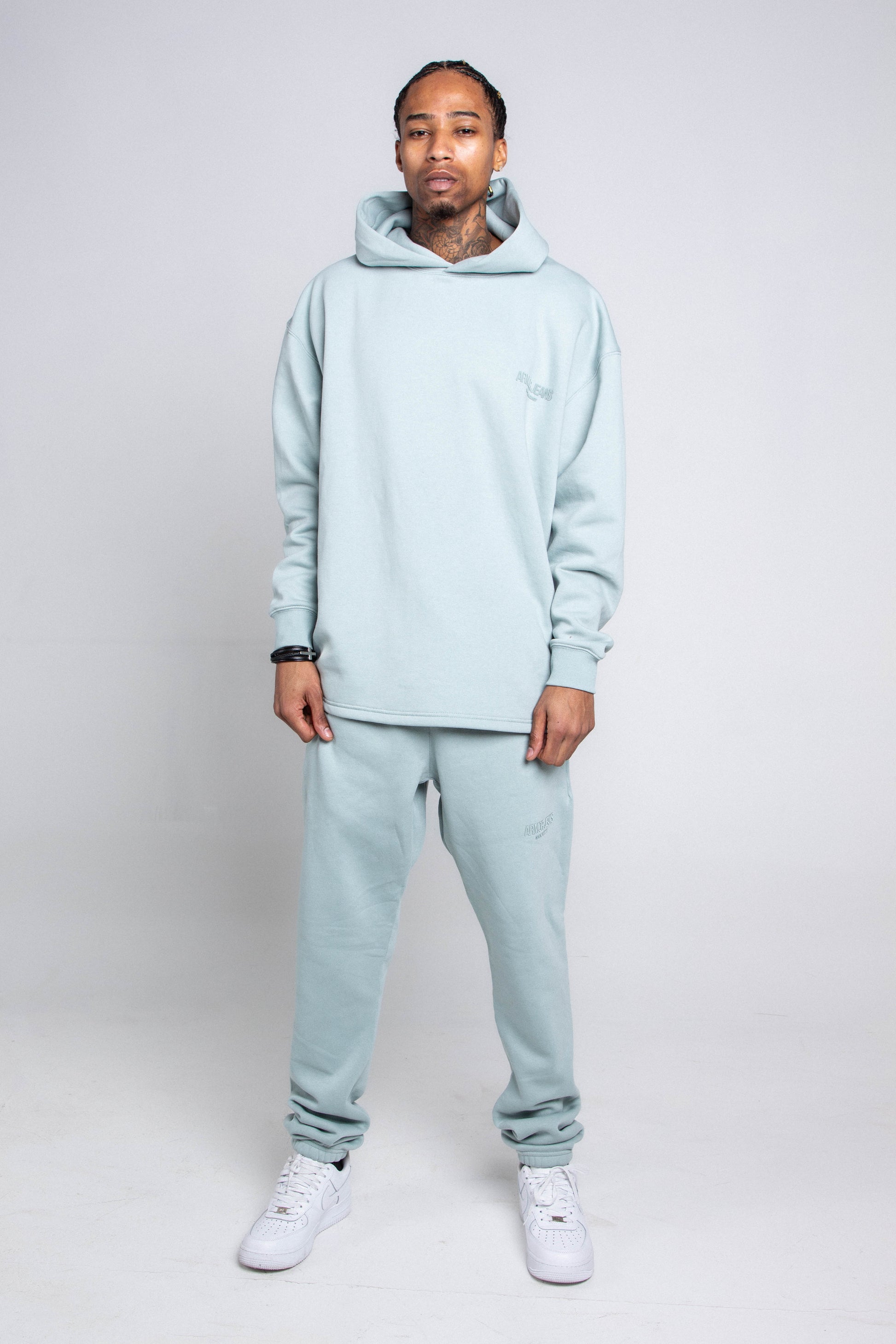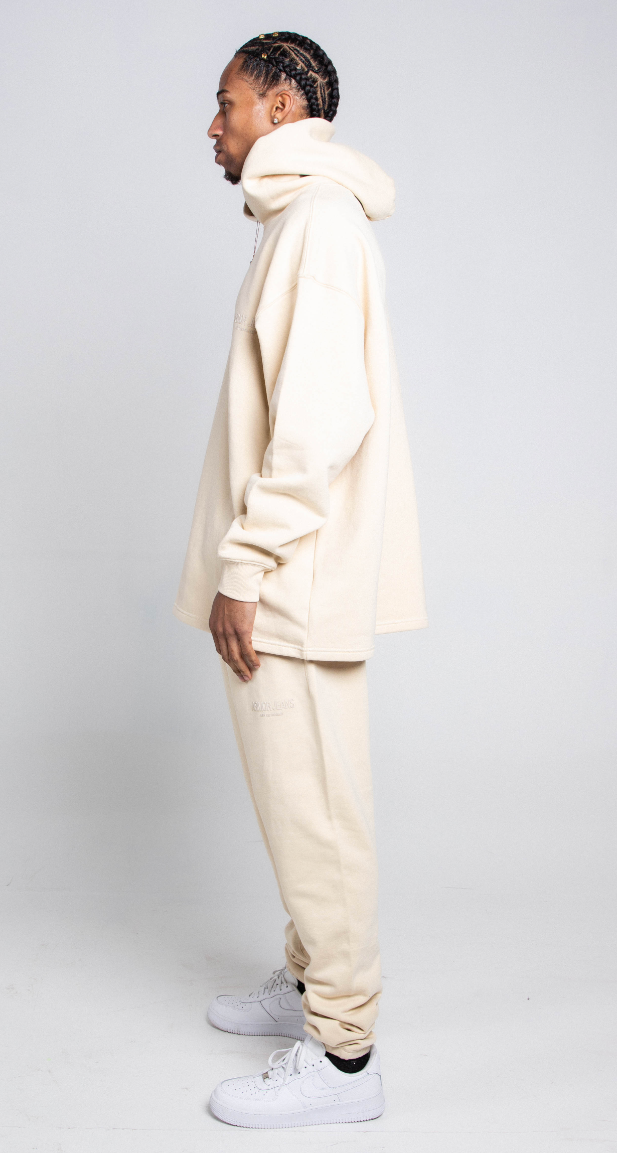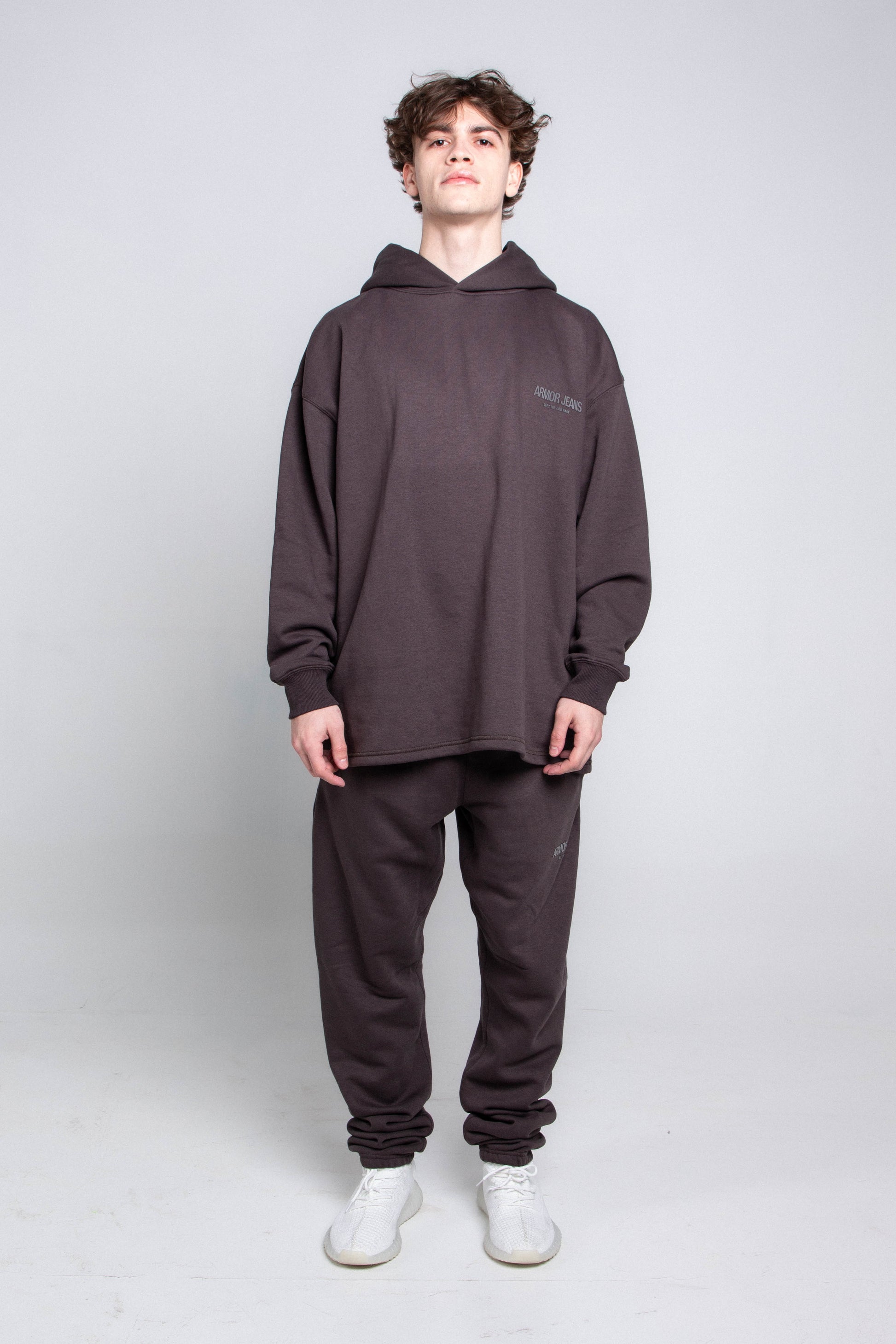 The matching sweatshirt is designed with a subtle tone-on-tone logo that adds a touch of sophistication, while the oversized hood offers extra warmth and a relaxed, casual look.